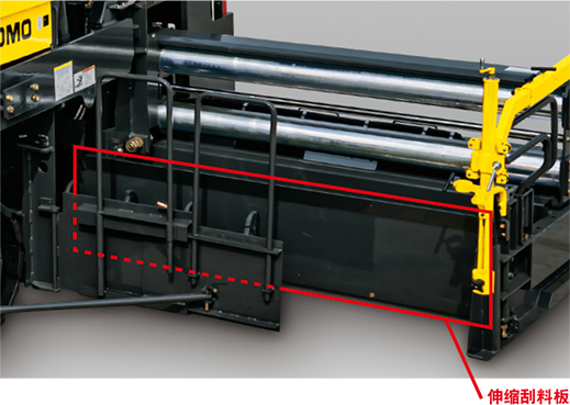 伸縮刮料板可與后熨平板聯動調節,更便于調節瀝青材料的堆積量。同時,瀝青材料也可順暢送達熨平板端部。
