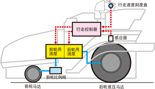 通過平行驅動方式,可以防止前輪打滑,實現機器的順利起步。另外,通過速度反饋系統,可以避免瀝青的負荷影響,維持穩定的行走速度。