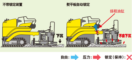 在等待成品材料或攤鋪作業(yè)暫時停止時,自動鎖定裝置起作用,揚程油缸自動防止熨平板下落。當攤鋪作業(yè)恢復(fù)時,通過電腦控制柔軟推進功能自動發(fā)揮作用。
