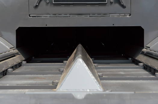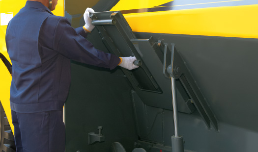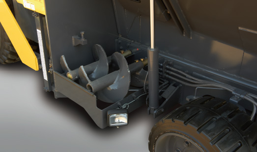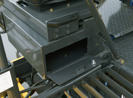 新形狀料斗的前部離地高度較低,和以往機型相比,與材料裝卸車的接車合理容易。料斗由兩側(cè)的油缸支持,便于供料以及防止材料外溢。