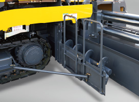 與后部熨平板連接的伸縮式流量調(diào)節(jié)板除了標準的手動型之外,還新設(shè)置了液壓式的選購件。外側(cè)使用液壓調(diào)整樣式,可以自如地調(diào)節(jié)合適的拌合料流量,實現(xiàn)拌合料向末端的順暢輸送。