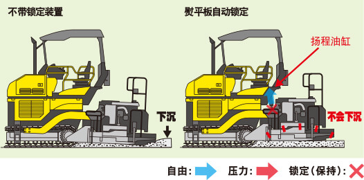 在等待成品材料或攤鋪作業(yè)一時停止時,自動鎖定裝置起作用,揚程油缸自動防止熨平板下落。當(dāng)攤鋪作業(yè)恢復(fù)時,通過電腦控制柔軟推進功能自動發(fā)揮作用。
