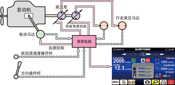 中央控制器同時控制發(fā)動機,液壓泵和行走馬達。通過電腦控制和簡單操作實現(xiàn)平穩(wěn)行走。由于保存已設(shè)定內(nèi)容,只需打開/關(guān)閉行走按鈕就能正常進行施工。