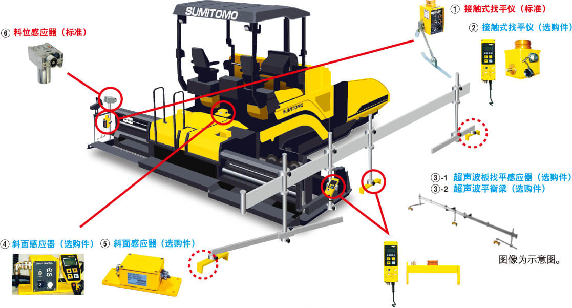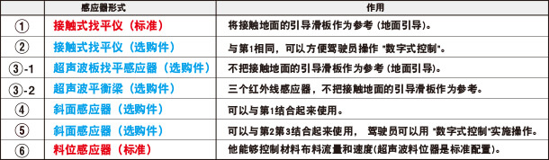杰平霸2875標(biāo)準(zhǔn)裝備AGC感應(yīng)器(接觸式找平儀)和超聲波合材流量控制儀,實現(xiàn)了高精度攤鋪質(zhì)量。還備有其它各種找平儀和斜面感應(yīng)器等作為選購件。