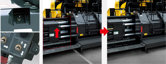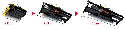 J.PAVER杰平霸 2875為住友原創(chuàng)的三聯(lián)伸縮式,可以在2.8米~7.5米之間一鍵式無級伸縮。施工過程中可非常順暢地切換攤鋪寬幅。采用了大口徑伸縮導(dǎo)管的高剛性構(gòu)造,在實現(xiàn)了高精度攤鋪品質(zhì)的同時,可放心作業(yè)。