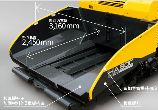 大容量料斗充分滿足施工現(xiàn)場所追求的快速作業(yè)以及縮短停歇時間的需求,采用了更便于接料的新型設(shè)計方案。平坦的底板可減少瀝青材料的堆積,更便于施工作業(yè)。提升了料斗開口部位的鋼板厚度,增加了料斗邊緣的導(dǎo)管加固條,提升了底板的厚度以及增加了加固材料,使得耐用性得到了大幅提升。