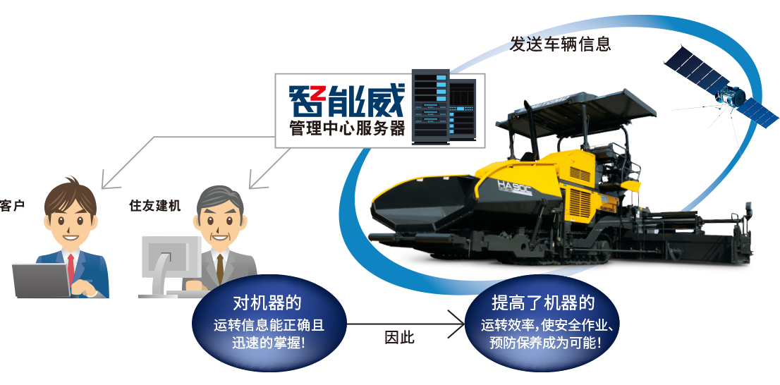 通過手機(jī)和電腦,可以隨時隨地確認(rèn)衛(wèi)星收集到的各種機(jī)器信息。住友建機(jī)與客戶共享機(jī)器信息,根據(jù)數(shù)據(jù)判斷定期檢查或液壓油的更換時間。萬一機(jī)器出現(xiàn)異常情況,也能通過報警信息查找并判斷原因。根據(jù)定位信息及時派遣技術(shù)人員。為客戶大幅度縮短因機(jī)器故障而停止工作的時間。確保提供迅速、準(zhǔn)確的服務(wù)。