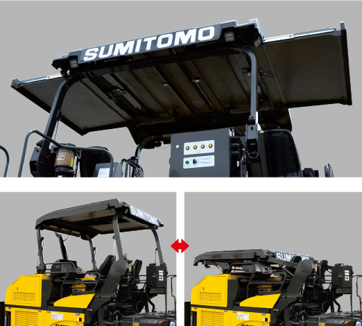 標(biāo)配玻璃鋼材質(zhì)的大型頂棚,提升了白天施工時的舒適性。通過手動泵可手動放下頂棚,在運輸時或者暫不使用時方便收納。搭載有新的滑動式大型遮陽板,進(jìn)一步提升了操作時的舒適性。