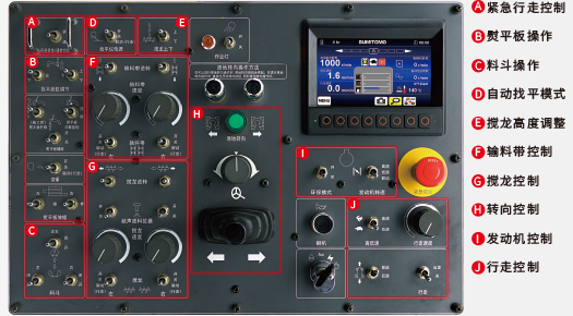 駕駛座前的主操作面板和熨平板操作箱都設(shè)有緊急熄火按鈕,達(dá)到安全作業(yè)的目的。