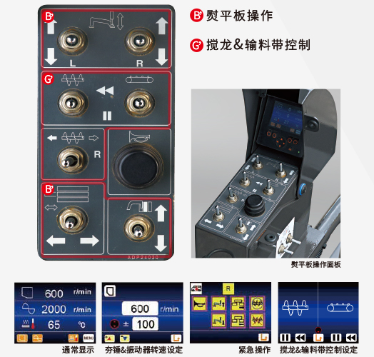 在左右熨平板操作箱的集中控制部位(控制伸縮、水平、輸料帶高速運轉(zhuǎn))設(shè)有彩色顯示器。夯錘和振動轉(zhuǎn)數(shù)、加熱溫度、緊急操作等各種操作的設(shè)定可以更容易進(jìn)行。不僅如此,攪龍和輸料帶還可 以單獨操作。