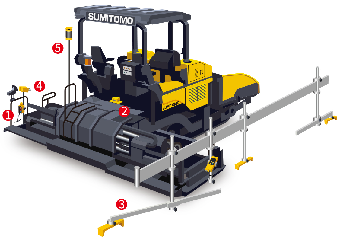 縱坡儀和橫坡儀可以減少作業(yè)強(qiáng)度并提高作業(yè)精度。根據(jù)事先輸入的三維設(shè)計數(shù)據(jù)可以實現(xiàn)鋪裝作業(yè)的自動化。本機(jī)也可以對應(yīng)先進(jìn)的三維機(jī)器控制系統(tǒng)。