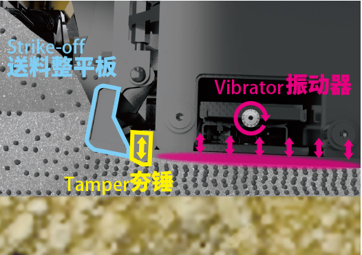 熨平板采用由送料整平板+夯錘+振動器組成的住友獨有的夯實系統(tǒng)。位于前方的送料整平板在對材料進(jìn)行排列和預(yù)壓實的同時,把排列好的材料順暢地輸送至夯錘和振動器,進(jìn)而實現(xiàn)高壓實度和高平坦性的高質(zhì)量攤鋪。