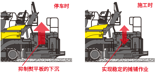 可以單獨調(diào)整停止時和施工中的熨平板輔助功能。停止時的輔助功能是通過自動鎖止功能抑制熨平板下降,防止出現(xiàn)熨平板壓痕,進(jìn)而避免發(fā)生攤鋪面凹凸不平。施工中的輔助功能是通過壓力控制來應(yīng)對從薄層到厚層攤鋪等各種施工條件或材料,進(jìn)而實現(xiàn)穩(wěn)定的攤鋪作業(yè)。