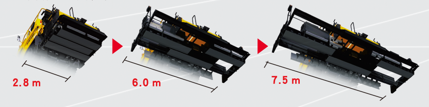 J.PAVER杰平霸 2875為采用三聯(lián)伸縮的住友技術(shù),可以在2.8米~7.5米之間一鍵式無級伸縮。施工過程中可非常順暢地切換攤鋪寬幅。采用了大口徑伸縮導(dǎo)管的高剛性構(gòu)造,在實現(xiàn)了高精度攤鋪品質(zhì)的同時,可放心作業(yè)。