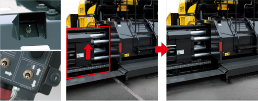 熨平板的進料高度(送料整平板角度)的調(diào)整由之前的墊片調(diào)整變更為內(nèi)部調(diào)整的方式。無論是從熨平板后方還是從側(cè)面都可以很方便地對進料高度進行調(diào)整,從而可以更好地對應(yīng)大顆粒或厚層攤鋪等各種施工。