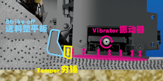 熨平板采用由送料整平板 + 夯錘 + 振動器組成的住友技術(shù)的夯實系統(tǒng)。位于前方的送料整平板在對材料進行排列和預(yù)壓實的同時,把排列好的材料順暢地輸送至夯錘和振動器,進而實現(xiàn)高壓實度和高平坦性的高質(zhì)量攤鋪。