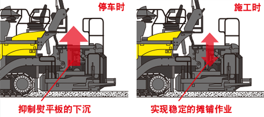 可以單獨調(diào)整停止時和施工中的熨平板輔助功能。停止時的輔助功能是通過自動鎖止功能抑制熨平板下降,防止出現(xiàn)熨平板壓痕,進而避免發(fā)生攤鋪面凹凸不平。施工中的輔助功能是通過壓力控制來應(yīng)對從薄層到厚層攤鋪等各種施工條件或材料,進而實現(xiàn)穩(wěn)定的攤鋪作業(yè)。
