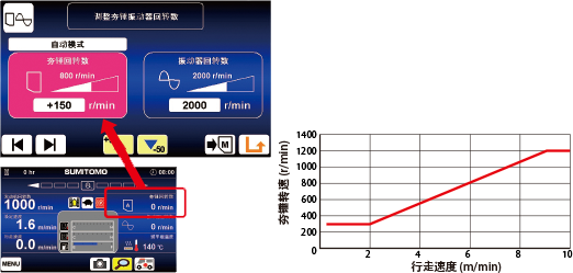 在使用自動模式時,系統(tǒng)會根據(jù)行走旋鈕的設(shè)定速度,按照標(biāo)準(zhǔn)條件自動設(shè)定夯錘的轉(zhuǎn)數(shù)(也可以根據(jù)材料或施工進行轉(zhuǎn)數(shù)調(diào)整)。另外,也可以通過手動模式進行手動調(diào)節(jié)夯錘轉(zhuǎn)數(shù)。熨平板邊控盒處的顯示屏也可以進行自動模式和手動模式的切換。