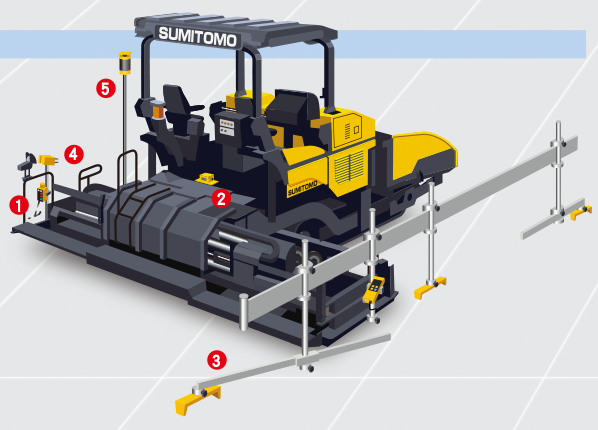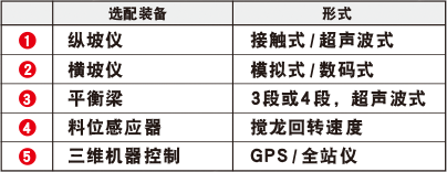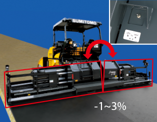 縱坡儀和橫坡儀可以減少作業(yè)強度并提高作業(yè)精度。根據(jù)事先輸入的三維設(shè)計數(shù)據(jù)可以實現(xiàn)鋪裝作業(yè)的自動化。本機也可以搭載三維機器控制系統(tǒng)。