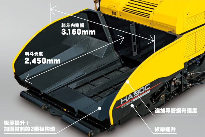 熨平板采用的是大口徑伸縮導(dǎo)管,提升了熨平板伸出時的剛性,確保了高水平的攤鋪平坦性,進而同時實現(xiàn)高精度的攤鋪和安心作業(yè)。