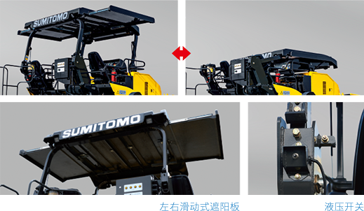 標(biāo)配大型FRP頂棚(帶左右滑動式遮陽板),提高日間施工的舒適性。頂棚升降可以通過液壓開關(guān)進行順暢操作,在運輸時或不用時可便捷收納。