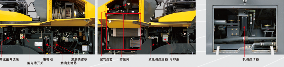 使用頻度高的需檢查類部件設(shè)置于機械兩側(cè)便于作業(yè)的位置,也有利于日常管理機械的狀態(tài)。冷卻裝置前設(shè)置有防塵網(wǎng),提高了冷卻裝置的保養(yǎng)性能。