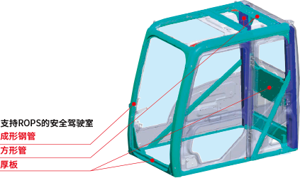 采用高強(qiáng)度駕駛室設(shè)計(jì),大幅提升操作員保護(hù)功能。支持翻轉(zhuǎn)時(shí)的保護(hù)結(jié)構(gòu)(GB標(biāo)準(zhǔn))的堅(jiān)固駕駛室結(jié)構(gòu)。