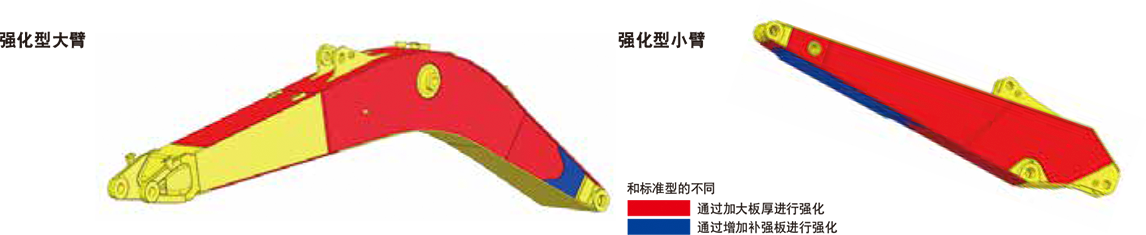 支撐作業(yè)的大臂和小臂,進(jìn)行了高負(fù)荷部形狀和結(jié)構(gòu)板的優(yōu)化,進(jìn)一步追求強(qiáng)度與耐久性。另外也加強(qiáng)了大臂和小臂連接部的耐久性。