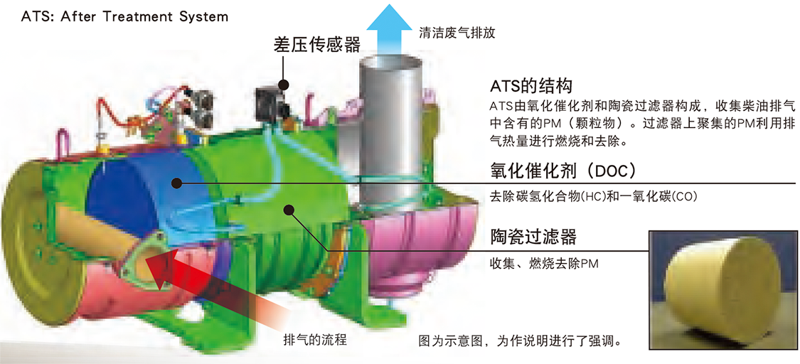 新采用ATS(排氣后處理裝置)對廢氣中的PM(顆粒物)進(jìn)行收集,燃燒去除并進(jìn)行后處理。PM聚集后由過濾器清潔控制自動開始燃燒等,追求出色的實(shí)用性。