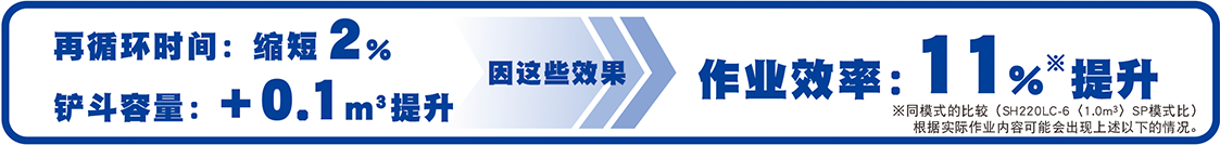 挖掘翻斗累計(jì)的作業(yè)時(shí)間,與現(xiàn)行SH220LC-6相比實(shí)現(xiàn)大幅速度提升。同時(shí)在有必要進(jìn)行微操作時(shí),操作性的控制更為優(yōu)越,大土量與操作性并存。