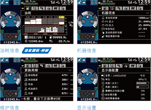 除了能看到各種機器信息及節能運行有用的油耗表之外,還顯示維護信息,各種警告等文字信息。通過簡單明了的準確信息傳遞,支持工作效率和安全性的提升。
