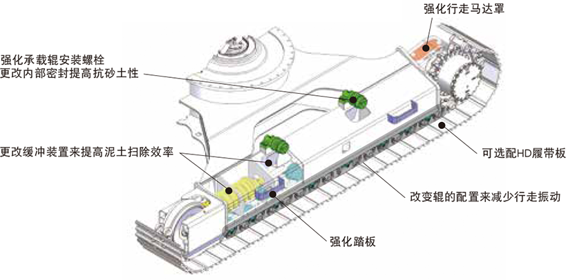 采用經過各部分改進,提高了耐久性的新型底盤,輥的適宜配置降低了行走振動。另外,前惰輪緩沖裝置的更改確保了承載輥下面空間,提高了泥土掃除效率。