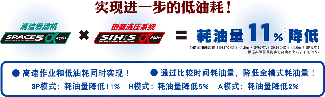 先進的清潔發(fā)動機“SPACE 5α”與住友建機的特制液壓系統(tǒng)“SIH:S α”同時兼顧工作效率和出色的耗油性能。