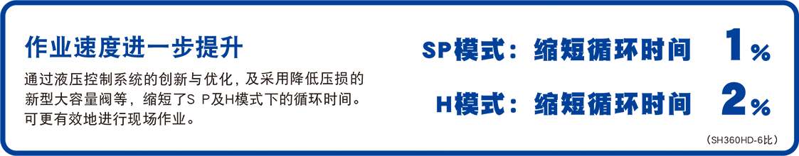 挖掘翻斗累計的作業(yè)時間,與現(xiàn)行SH360HD-6相比實現(xiàn)大幅速度提升。同時在有必要進行微操作時,操作性的控制更為優(yōu)越,大土量與操作性并存。