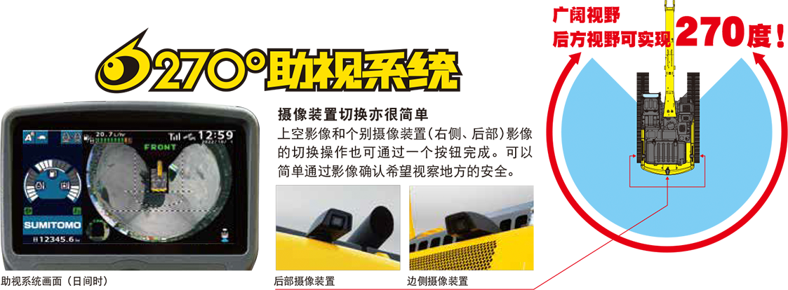 顯示屏是住友建機(jī)特制的可選配的270°助視系統(tǒng)。后方視野270度。駕駛員的安全確認(rèn)非常容易,現(xiàn)場安全可進(jìn)一步用人眼進(jìn)行確保。另外攝像頭可進(jìn)行切換,顯示屏畫面夜間亦能清晰可見。