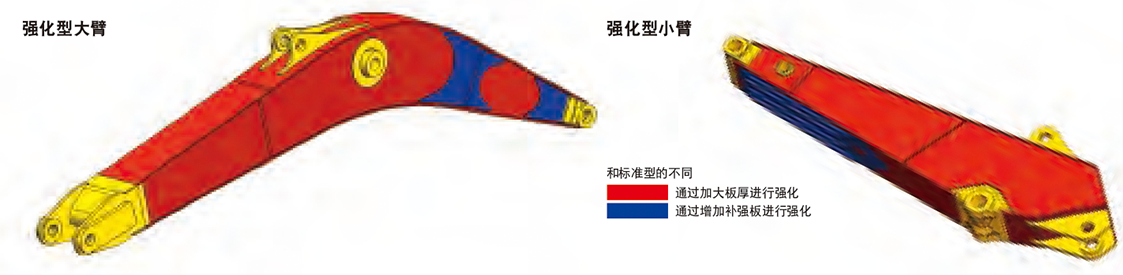 支持作業(yè)的大臂和小臂,進(jìn)行了在高負(fù)荷部的板厚加大等以及構(gòu)造的變更,采用進(jìn)一步追求強(qiáng)度與耐久性的加強(qiáng)型。另外也加強(qiáng)了連接部的信賴性。