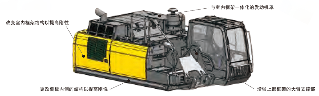 通過對(duì)駕駛室構(gòu)造的優(yōu)化以及各部分強(qiáng)度的強(qiáng)化、駕駛室的強(qiáng)度大幅提升。即使在挖掘機(jī)意外翻倒的情況下,也能通過盡量抑制駕駛室變形,
