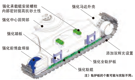 軌輥和前惰輪的改良提高了底盤的耐久性。另外,內(nèi)部密封性的提升也提高了抗砂土性。