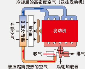 吸入的空氣在渦輪加載器的壓縮下形成高溫,經(jīng)中間冷卻器冷卻后可提高吸入效率。在大幅度減少NOxPM的同時(shí),提高了輸出功率,減少了油耗。