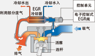 采用冷卻式EGR系統(tǒng),獲得進(jìn)一步減少NOx(氮氧化合物)的效果。其做法是在對(duì)排放的氣體再循環(huán)以降低燃燒溫度的EGR(Exhaust Gas Recircu-lation)上設(shè)置水冷式冷卻器。